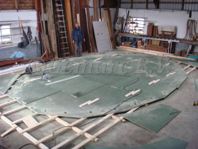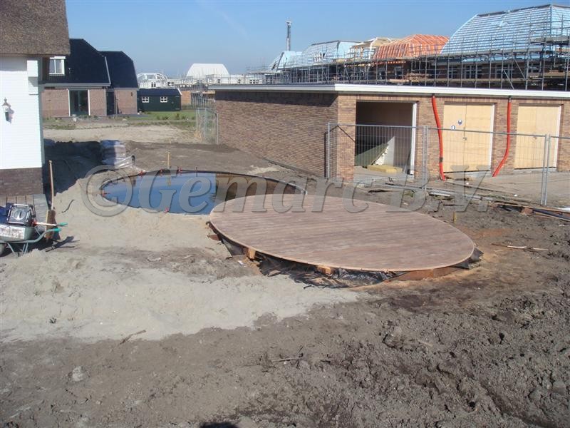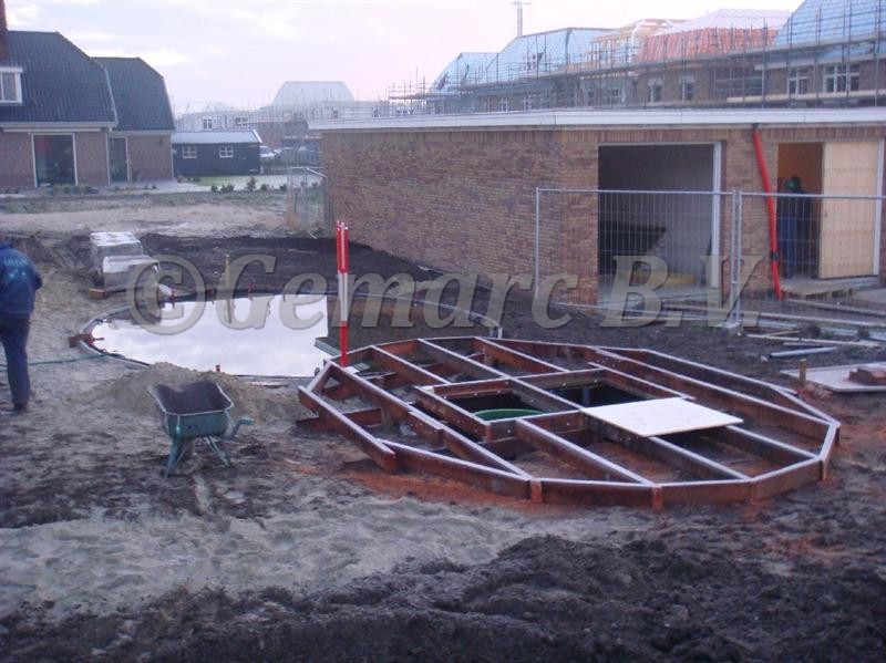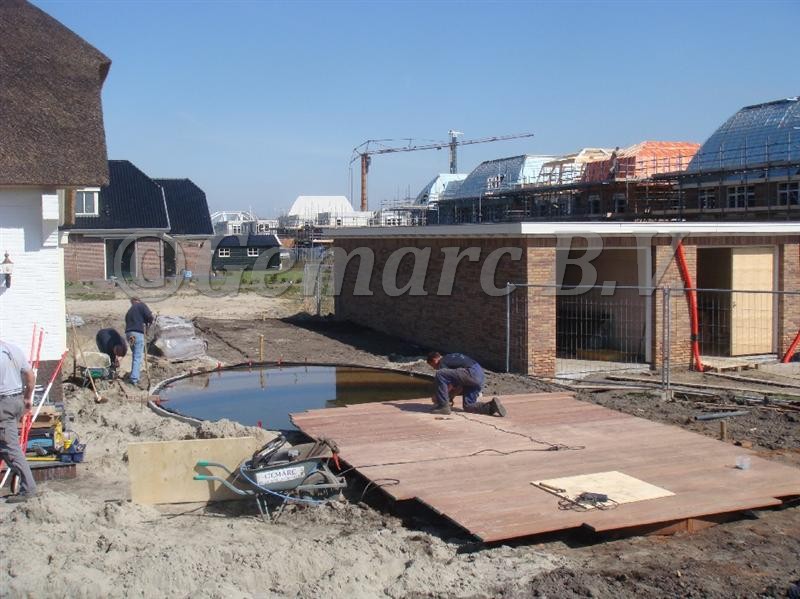 Voor deze ovale vijver met vlonder hebben we op de werkplaats eerst een mal gemaakt welke we daarna op de werkplek hebben neergelegd en van daaruit het frame voor de vijver en het vlonder gemaakt.